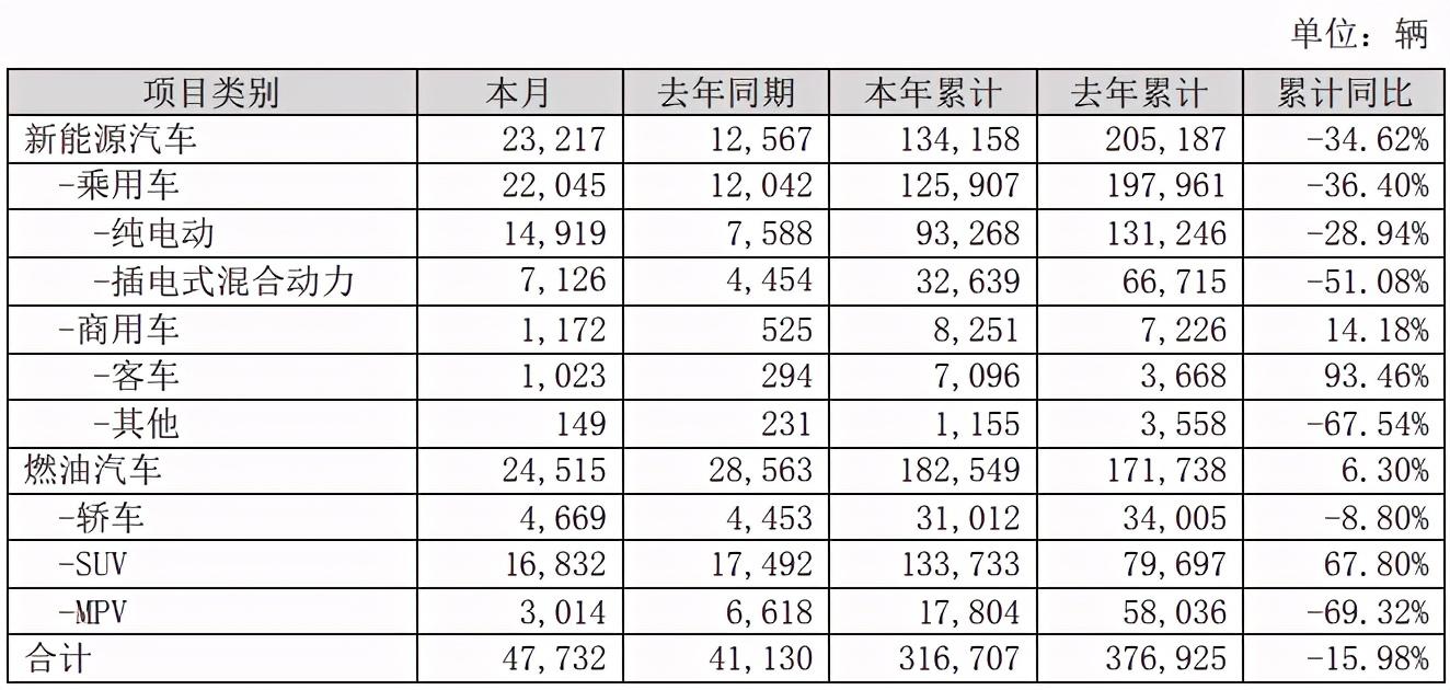 今年1-10月,比亚迪共销售汽车316707辆,其中新能源汽车134158辆,去年同期新能源汽车销量为205187辆。