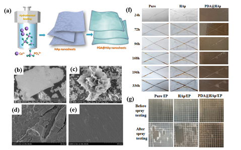 图1 (a)水热法制备多巴胺改性羟基磷灰石纳米片示意图;(b,c)羟基磷灰石纳米片和羟基磷灰石纳米片纳米花形貌;(d,e)改性前后羟基磷灰石纳米片在涂层中的分散效果;(f,g)纳米片盐雾测试及测试前后粘附性能百格图