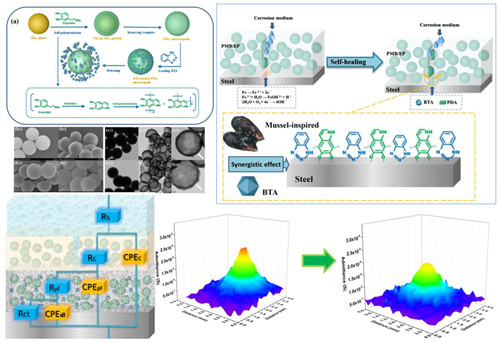 除此之外,针对聚多巴胺的缓蚀特性,团队还使用一种简单的硬模板法制备了聚多巴胺纳米空心胶囊并负载传统缓蚀剂苯并三氮唑在涂层中起到协同自修复效应(图2)。在金属腐蚀发生的初期阶段,即可迅速与铁或铁离子配位形成致密的防护薄膜,吸附在金属表面阻止进一步腐蚀的发生,提升传统有机防护涂层的微区域缺陷主动修复性能,相关结果发表于期刊J. Mater. Sci. Technol.(Accepted)。