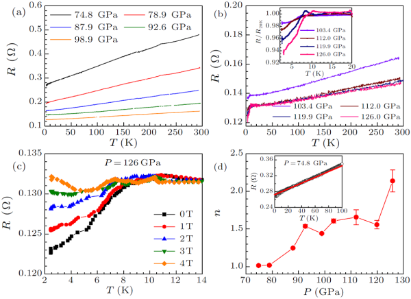 图2.压力诱发的NaYbSe2超导电性。(a)NaYbSe2在74.8到98.9 GPa压力区间内电阻随温度变化的曲线。(b)NaYbSe2在103.4到126 GPa压力区间内电阻随温度变化的曲线,电阻的突然降低表明出现了超导迹象。(c)126 GPa压力下超导转变温度随外磁场的变化,证实了超导属性。(d)R(T) = R0 + ATn公式拟合金属态得到的n值随压力的变化,表明随压力增加发生从非费米液体到费米液体行为的变化