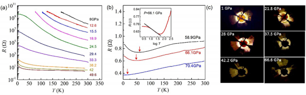 图1.NaYbSe2压力作用下从绝缘体到金属的转变。(a)NaYbSe2在49.6 GPa以下的电阻随温度变化的曲线。(b)NaYbSe2在58.9到70.4 GPa压力区间内电阻随温度变化的曲线,箭头所指表示出现弱局域化,插图是在66.1 GPa压力下电阻随温度的对数曲线。(c)NaYbSe2压致变色的光学照片,表明随压力增加其能隙逐渐减小
