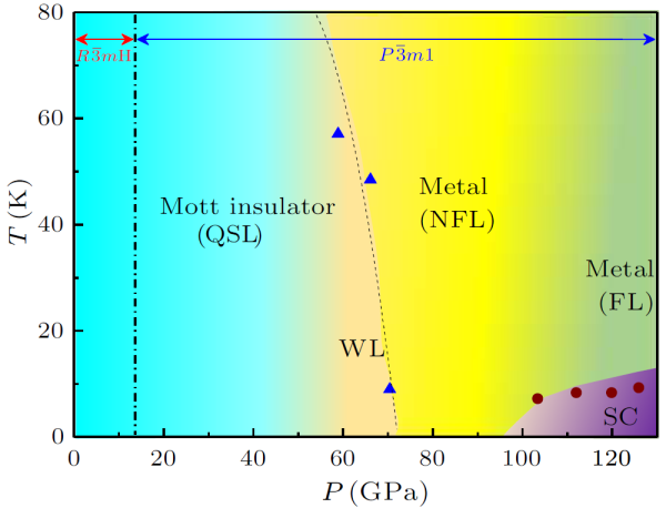 图3.NaYbSe2的温度-压力(P-T)相图。其中WL,SC,QSL,FL和NFL分别代表弱局域化、超导电性、量子自旋液体、费米液体和非费米液体