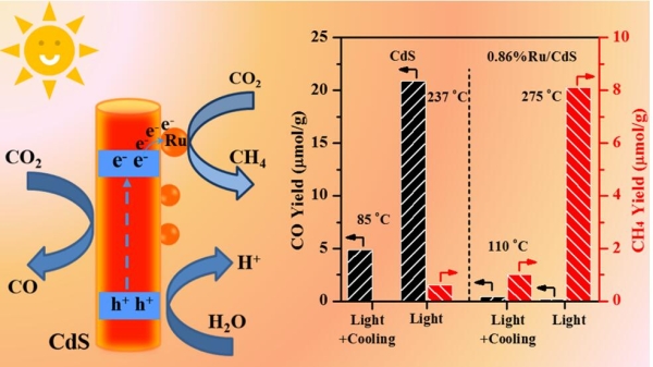 中国科学院城市环境研究所贾宏鹏研究团队通过简易的沉积/沉淀法,制备以硫化镉(CdS)为载体的高分散钌(Ru)单原子催化剂。通过催化剂调控Ru负载量,使其在全光谱照射下展示出较高的甲烷产物选择性(97.6%)。Ru单原子的引入并未改变CdS的本质结构,但提高了催化剂对CO2的吸附量,促进光生电荷的分离效率,有利于CO2转化为CH4。同时,该催化剂具有较好的光热转化性能,协同产生的光热效应可有效提高催化性能,且未改变产物选择性。该研究为提高太阳光利用率以促进催化活性提供新策略。