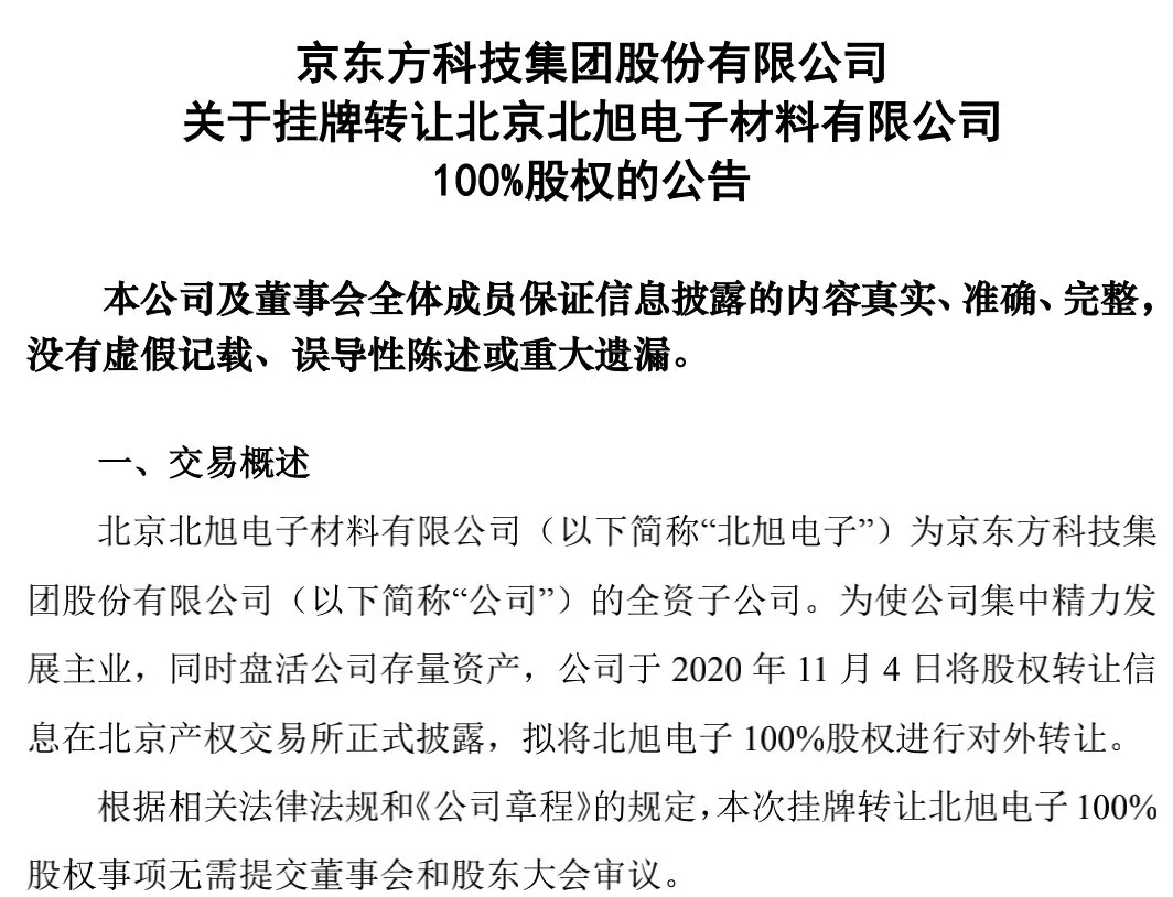 京东方11月3日晚间发布公告,公司于2020年11月4日将股权转让信息在北京产权交易所正式披露,拟将全资子公司北京北旭电子材料有限公司(以下简称“北旭电子”)100%股权进行对外转让。