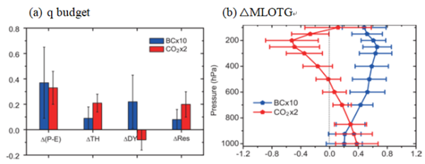 图2. (a) 人为黑碳气溶胶和CO2引起的水汽收支变化 q budget (mm day-1),包括夏季有效降水量变化△P-E,热力项△TH,动力项△DY,以及其余项△Res。(b) 亚洲与海洋海陆南北梯度的变化 △MLOTG (摄氏度)。