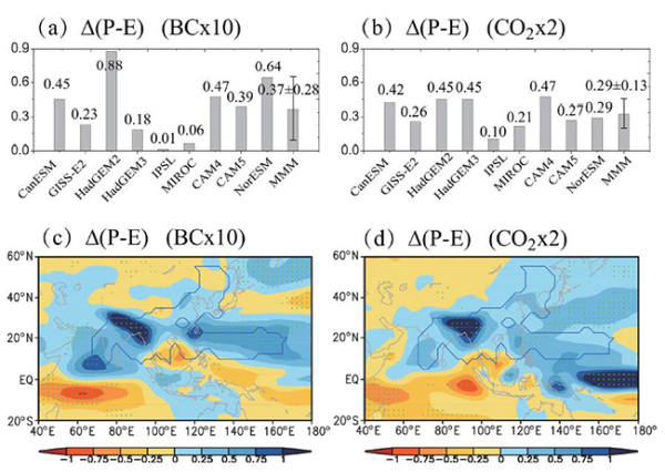 图1. 人为黑碳气溶胶和CO2引起亚洲夏季风有效降水量P-E的变化(单位:mm day-1)。(a, b) 亚洲季风区域即蓝色实线区域内空间平均值以及多模式的平均值MMM;(c, d) 多模式平均有效降水变化的空间分布。