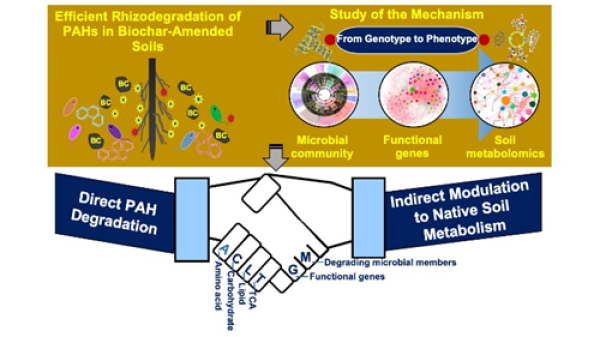 多环芳烃(PAHs)是我国农田土壤中主要有机污染物类型之一。针对面广量大的污染农田土壤,原位生物修复是一种绿色高效、环境友好的修复措施。中国科学院南京土壤研究所研究员蒋新团队针对PAHs污染农田,利用大宗农业废弃物为原料制备生物质炭,提出生物质炭阻控-植物根际强化降解协同修复措施,系统阐明了根际环境中生物质炭-污染物-微生物多界面交互作用,实现安全高效的边生产、边修复过程。