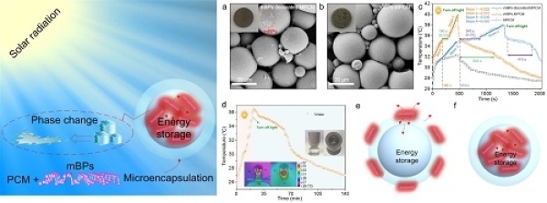 左图:光热相变微胶囊太阳能存储示意图;右图:a,b分别为黑磷在微胶囊表面、内部扫描电镜表征;c图为微胶囊材料光热转换及存储温度-时间曲线;d图为模拟光热相变微胶囊实际应用效果图;e,f图为两种光热相变微胶囊能量存储机理图。