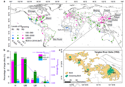 图1 全球大城市分布与城市显著变绿区域占比