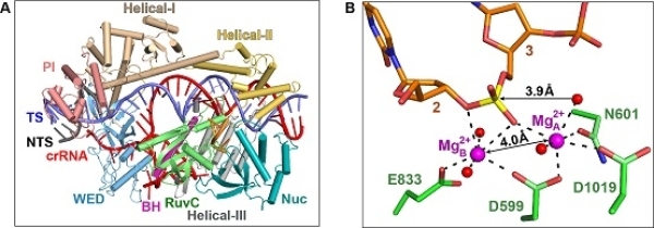 Cas12i2的结构生物学研究。A.Cas12i2-crRNA-DNA三元复合物的整体结构;B.Cas12i2的RuvC结构域催化中心