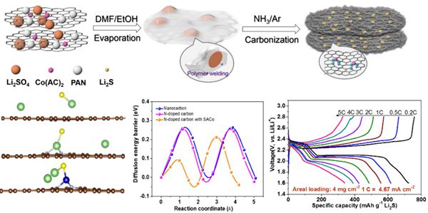 中国科学院苏州纳米技术与纳米仿生研究所研究员张跃钢与蔺洪振团队分别从纳米材料结构设计与表面功能化出发,制备不同的活性纳米催化剂复合材料,选用原位光谱手段研究其相关作用机制。研究人员优化调控三维石墨烯的孔隙结构及其功能团,实现对可溶的多硫化物的物理与化学强吸附作用(Journal of Power Sources, 2016, 321, 193);利用原位化学聚合的方式,增强三维石墨烯/碳纳米管的复合纳米材料的结构稳定性,实现高面积载量(10.2 mgcm-2)硫正极的长寿命稳定循环(图1)(Nano Energy, 2017, 40, 390)。同时,研究发现仅靠物理化学吸附的手段抑制穿梭效应具有局限性,不能满足电池的快速充放电特性。鉴于此,该研究提出多种“吸附+催化”的策略,综合解决锂硫电池的关键问题,用一步法合成高活性的氧缺陷金属氧化物(ODMO)纳米团簇催化剂,实验和理论模拟结果证实,氧缺陷活性位点可显著加快多硫化物中S-S键的断裂与生成,使电池的容量减率低至0.055%,满足快速充电/放电以及长期稳定的性能要求(ACS Applied Materials & Interfaces, 2020, 12, 12727)。为了降低不导电性反应产物硫化锂充电时脱锂离子的难度,加快电化学反应的速度,研究将单原子催化引入到锂电池领域,结合球差矫正电镜和同步辐射X射线吸收光谱(XAS)证实单原子催化剂的存在。结果显示,单原子催化剂可明显改善基于转换反应电池的充放电速率,在12C(理论5分钟充满)时电池的容量仍有58 8mAh g-1),在5C时1000次循环容量衰减率为0.06%。研究团队还通过原位XAS手段,初步研究单原子铁催化剂在脱锂过程中的演化规律(Energy Storage Materials, 2019, 18, 246)。此外,为了满足高面积载量锂硫电池的商业化要求,大容量电池需实现电池的快速充放电。为解决此问题,研究人员在纳米碳基底上制备出均匀负载分布单原子钴(SACo)催化剂复合正极材料,证明单原子催化剂可以加快锂离子在高面积载量Li2S电极反应中的扩散速率,为实现高能量密度与功率密度的锂电池提供研究思路(Energy Storage Materials, 2020, 28, 375)。