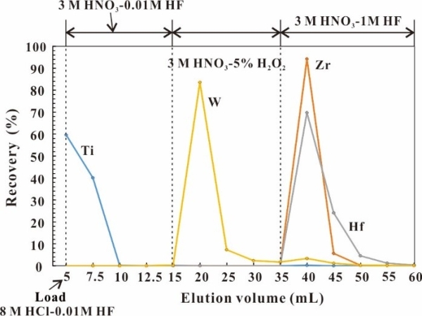 传统W纯化方法主要采用阴离子或阳离子交换树脂法,利用W在含氢氟酸的介质中形成氟络阴离子的特性,实现W与基体元素的分离。但是,由于Ti、Zr、Hf等高场强元素在含氢氟酸的介质中也能形成氟络阴离子,因此,采用传统的离子交换技术实现W与Ti、Zr、Hf等高场强元素的完全分离存在较大难度。此外,Ti在幔源岩石如玄武岩中为主量元素,含量较高,样品Ti/W比通常大于105,因此,实现Ti-W的完全分离具有挑战性。然而,无论采用MC-ICP-MS或NTIMS,尤其是NTIMS,Ti-W的彻底分离是高精度W同位素分析的先决条件。采用传统离子交换树脂法,一般需要进行3次甚至4次柱色谱分离;分离过程中,需要在解析W之前,采用大体积(> 100 mL)的含有醋酸或柠檬酸的淋洗液洗脱Ti,其耗时费力,且不利于降低流程本底。
