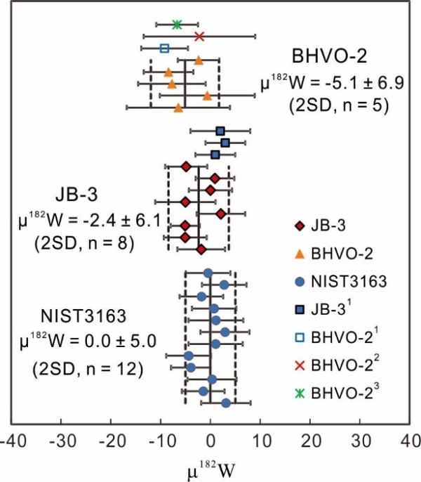 图2.NIST3163 W溶液标样及USGS BHVO-2、GSJ JB-3玄武岩标样W同位素测定结果。文献数据:1.Mei et al. 2018,JAAS;2. Kruijer et al. 2018,CG;3.Peters et al. 2019,GGR