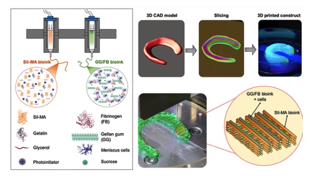 生物工程纤维软骨组织以恢复半月板功能是组织工程研究的热点。生物3D打印技术也被用于此领域以满足临床对复杂软骨结构的制造需求,近期,Wake Forest的James J. Yoo和Sang Jin Lee课题组在Chemistry of Materials(IF=9.567)期刊上发表了“3D Bioprinted Highly Elastic Hybrid Constructs for Advanced FibrocartilaginousTissue Regeneration”的文章,通过打印结冷胶/纤维蛋白原(GG / FB)复合生物墨水与一种丝素甲基丙烯酸甲酯(Sil-MA)生物墨水,来制造用于纤维软骨再生的高弹性复合构建体。