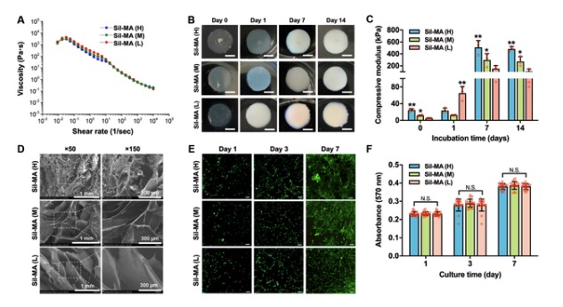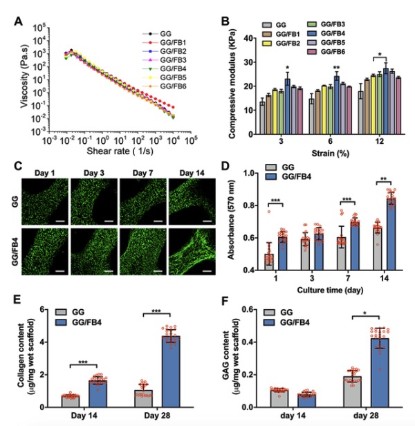 研究者通过打印交错排列的GG/FB墨水和Sil-MA墨水3D复合结构,发现打印的结构体的机械性能与天然组织相似,因此适合于3D生物打印的患者特定植入物的生物制造,以进行软骨/纤维软骨再生。此外,重要的是要强调 可以使用不同程度的甲基丙烯酸酯和不同浓度的SF来调节目标机械性能。