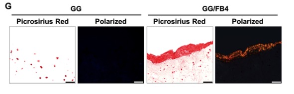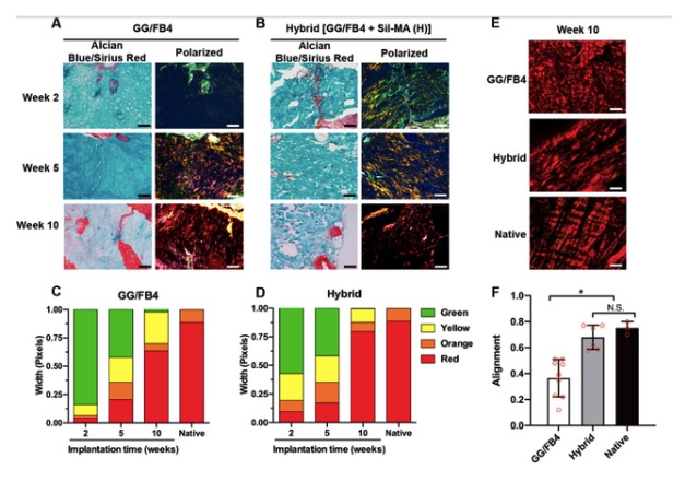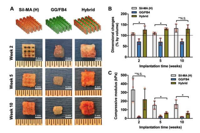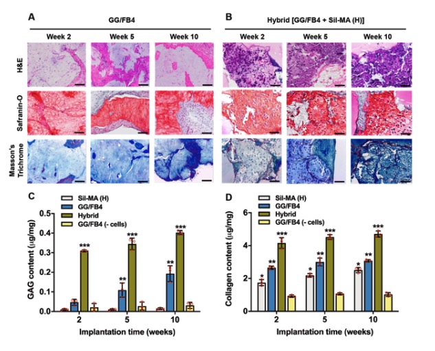 研究者通过将打印交错排列的GG/FB墨水和Sil-MA墨水3D复合结构植入小鼠皮下,发现植入后的10周内,在小鼠皮下植入模型中显示了纤维软骨组织的形成,而没有尺寸变化。特别地,在生物打印的杂交构建体中实现了胶原纤维的排列。