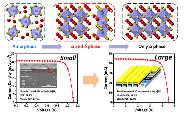 近日,该团队采用狭缝涂布沉积技术结合高压氮气萃取(high pressure nitrogen-extraction)策略,有效调控钙钛矿薄膜的形核和晶粒生长,并驱动稳定中间相的形成,从而沉积制备出均匀致密的钙钛矿薄膜。同时,该团队研究发现,狭缝涂布沉积结合高压氮气萃取技术可以实现宽窗口大面积印刷钙钛矿薄膜,提高器件良率。此外,为了有效减少钙钛矿表面缺陷,该团队采用离子液体对表面进行了有效的钝化处理,将小面积太阳电池的效率提高至22.7%,并将该策略成功地扩展到大面积太阳电池制造,在40×40mm2的衬底上制备的钙钛矿电池组件的稳态输出效率达到19.4%,是迄今为止大面积组件的最高效率。