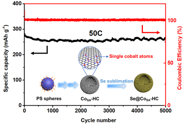近日,中国科学院大连化学物理研究所研究员刘健团队与中国科学技术大学教授宋礼、悉尼科技大学副教授刘浩及教授汪国秀团队合作,制备出N掺杂空心多孔碳负载Co单原子纳米反应器(CoSA-HC)。该反应器作为锂-硒电池正极,表现出较高的放电容量、较好的倍率性能和循环稳定性,其库仑效率接近100%,为金属-硫族电池(MCB)电极的设计提供新思路。