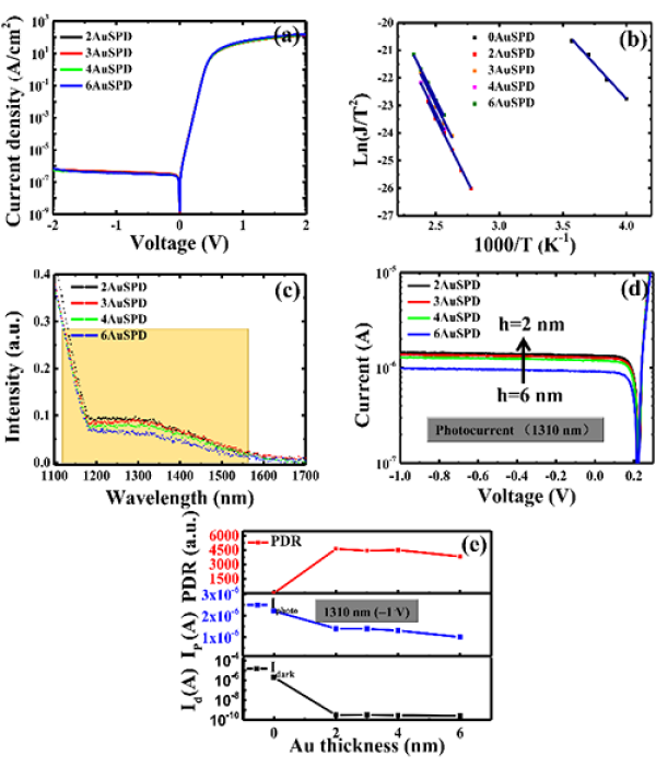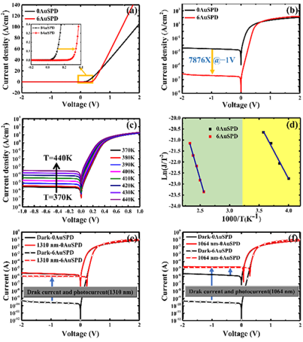 图2. (a)线性坐标(b)半对数坐标下0nm和6nm Au肖特基光电探测器暗态室温J-V特性(c)6nm Au探测器J-V温度依赖特性(d)Ln(J/T2)和1000/T关系图(e)1310 nm(f)1064 nm激光下室温光、暗态J-V特性。