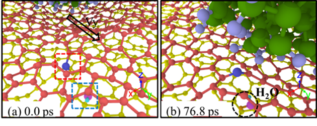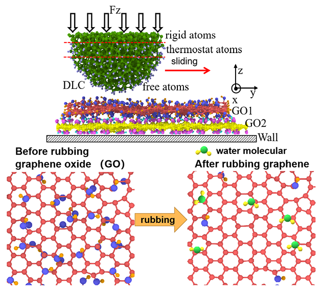 研究发现,在宏观球-盘接触摩擦实验过程,摩擦轨道上的氧化石墨烯发生了向完美石墨烯结构的原位大尺寸转变。实验检测到该过程伴随着氧化石墨烯羟基官能团的减少以及水分子的溢出。其中摩擦力作用而非静压力驱动了该转化过程,而且当与有活性键的配副摩擦时更有益于该转变现象的发生。研究人员进一步结合分子动力学模拟计算,揭示了转变过程的分子作用机制:在滑移摩擦力剪切作用的驱动下,激活了氧化石墨烯的羟基官能团与摩擦配副上的活性键以及相邻石墨烯片层上羟基官能团之间的化学相互作用,诱导发生C-OH键的断裂。断裂后碳原子由sp3态向能量更稳定的sp2态转化,实现六元环结构的自修复;断裂后-OH基或与配副悬键结合,或夺取相邻片层-OH上的氢生成水分子溢出。