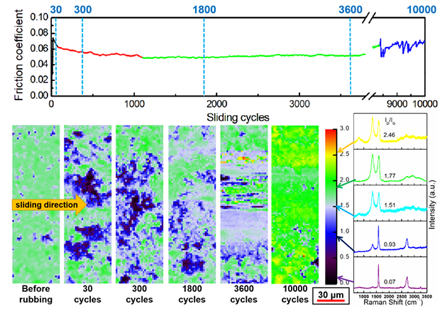 整个摩擦过程中,氧化石墨烯向石墨烯结构的转变使得摩擦系数进一步降低且平稳,因此利用该摩擦结构演变现象,可以主动调控、获得摩擦界面的理想石墨烯结构,实现平稳、长效的润滑状态,对于推动其实际应用具有重要价值。同时利用结构转化过程中伴随的摩擦力致水分子脱溢行为,通过对水分子的监测,可以为力致传感提供新的思路。