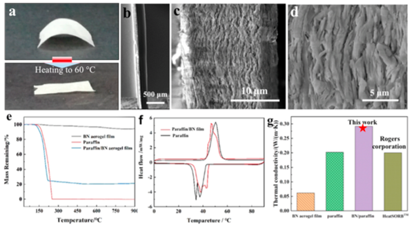 图2 不同温度下氮化硼气凝胶相变复合薄膜的光学照片(a)、薄膜的微观形貌(b-d)及热性能(e-g)。