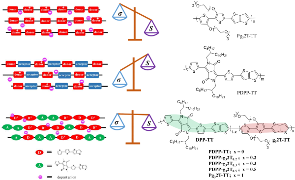 经典的聚噻吩类(上)、给-受体交替型聚合物(中)以及研究中设计的新型聚合物(下)化学掺杂特征和热电参数关系