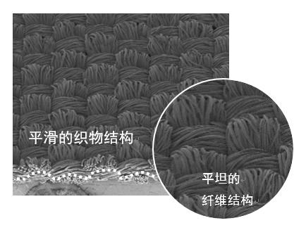 普通聚酯面料是由平坦的纤维结构组成的平滑织物结构,相反,此次开发的新面料是由不规则的纤维结构组成的微细凹凸层结构。