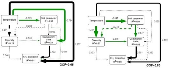 结构方程模型揭示增温对三江平原(左)和海北沼泽湿地(右)甲烷氧化潜势的影响