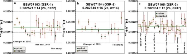 GSR-1、GSR-2、GSR-3的176Hf/176Hf比值与已发表数据对比