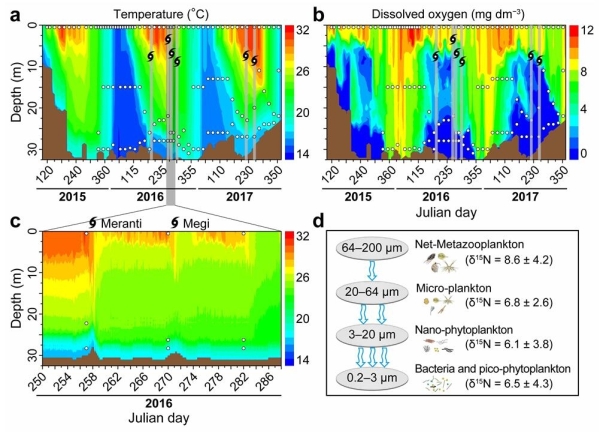 在当前气候变化背景下,预计全球热带和亚热带地区台风事件(也称为热带气旋或飓风)的强度将持续增加,由此带来的强风和暴雨灾害事件将造成当地经济和生态系统功能的损失。深水型水库和湖泊具有重要的科学和社会服务价值,这些水体的一个典型特征是水体上下分层,例如表层水体(湖上层)藻类较多和底层水体(湖下层)营养丰富。强风引起的混合扰动可以将深层水体的营养物质带到光照充足的表层水体,而强降雨还可能会增加水体的陆源营养物质输入。这些营养盐的波动性增加通常伴随着藻类生物量的增加或浮游生物群落组成的变化。然而,在一个不断变化的环境中,采用新方法结合较高频率观测会促进人们对突发性干扰事件后深水水体生物地球化学过程的理解。