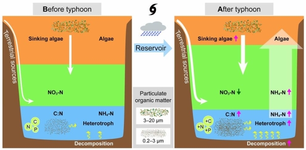 中国科学院城市环境研究所水生态健康研究组研究员杨军团队选择亚热带深水型水库为研究对象,进行了为期三年的研究,以阐明环境变化、颗粒有机物的稳定同位素和化学计量、以及营养循环对台风的响应及其内在相互关系。结果显示,台风显著改变了深层水体的营养水平以及温跃层深度,导致水库表层水温降低、底层水温升高。台风后短期(如台风后的前10天)内,中层水体颗粒有机物浓度大于底层水体,而随后底层水体颗粒有机物浓度快速升高,并逐渐超过中层水体;而且,中层水体颗粒有机物的浓度在台风后短期内显著增加,但随后又迅速下降恢复至台风前的浓度水平,这伴随了底层颗粒有机物(藻类和死亡有机物)的积累和浓度的持续增加,表明台风后有机物(包括藻类)沉降是底层有机物的主要来源。随机森林和路径分析结果同样表明,叶绿素a与中层和底层水体的颗粒有机物和营养循环显著相关,因此台风事件驱动的陆源有机物输入增加、藻类沉降和细菌异养分解共同作用,导致水库底层水体中总氮、铵态氮和总磷急剧增加且长期维持高浓度,进而增加水库和下游水体富营养化的威胁。台风后,底层水体的微微型颗粒有机物(0.2–3 μm)显著增加,该粒径的颗粒有机物对台风的响应比其他粒径的颗粒有机物(3–20、20–64、64–200 μm)更加强烈,并且台风后第一个月内微微型颗粒有机物一直保持较高的水平。进一步分析表明,微微型颗粒有机物的浓度和计量学比值(如碳氮比和氮磷比)是底层水体营养循环的重要指标,颗粒有机物的氮同位素与氨氮浓度显著相关,说明台风促进了底层水体的氮循环过程,造成氨氮的持续积累。台风后底层水体微微型颗粒有机物的C:N比值的增加可以降低营养级之间的能量传递,有利于底层水体中的异养分解过程,而且颗粒有机物的稳定同位素和浓度对底层营养循环具有直接效应,这些证据表明,台风主要通过微微型的颗粒有机物(含细菌)促进深层水体的营养循环。因此,台风后,底层水体有机物输入的增加和营养循环的加速增加了深水水库富营养化和有害藻类水华发生的风险。