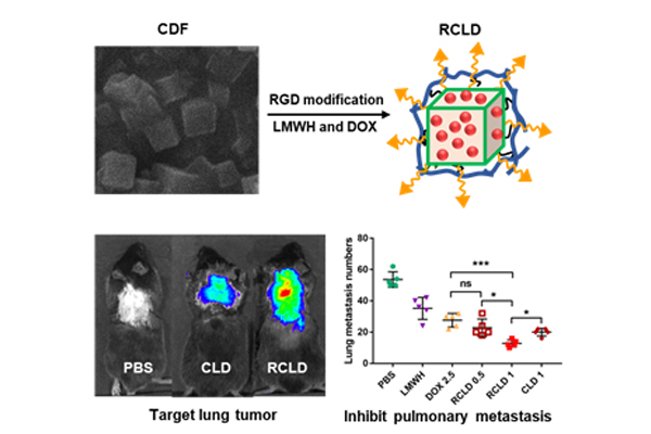 CDF采用安全性高的药用辅料γ环糊精,组装形成具有新颖纳米结构的新型药物载体。研究发现,纳米级CDF高度地靶向肺部,采用寡肽GRGDS靶头对CDF进行表面修饰,同时负载低分子肝素(LMWH)和阿霉素(DOX),构建新型的肺癌靶向递药系统RCLD。RCLD既可以利用CDF的肺靶向功能,靶向到肺组织本身,也能通过RGD靶向肺癌细胞和肿瘤新生血管过表达的整合素,利用二级靶向原理将抗肿瘤药物DOX和LMWH准确地输送到肺癌部位。体外实验表明,RCLD可以显著地抑制肿瘤细胞的迁移和侵袭。RCLD在A549人肺腺癌转移模型中,有效地抑制肺癌的生长和转移。RCLD也能抑制B16F10小鼠黑色素瘤的肺部转移。在同等疗效时,RCLD将DOX的剂量降低了5倍,减少了DOX的毒副作用。此外,RCLD在小鼠体内没有诱发急性毒性或组织坏死,生物安全性良好,具有重要的临床应用前景。