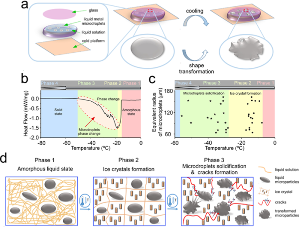 近年来,液态金属作为新一代刺激响应形变材料崭露头角。研究表明,液态金属能够响应多种类型的外部条件刺激,包括电场、化学场、光能、机械力以及电化学刺激等方式通过对表面氧化物调控改变材料的表面张力以实现各类型形变。目前,这些刺激响应的形变现象已经应用在柔性电子、药物递送、自驱动柔性机器等领域。虽然液态金属柔性的内核致使材料形变的发生比较容易,但是维持这种形变还需要外部能量的不断供给。另一方面,基于液态金属的更多种类的刺激响应方式还有待进一步开发以拓展其应用范畴。室温环境是各类刺激响应形变发生的常见条件,相比之下,低温物质科学却蕴含着大量的未知。低温是各类冰晶生长、室温流体液固相转变的条件,对液态金属低温刺激,会产生一系列奇特的现象。