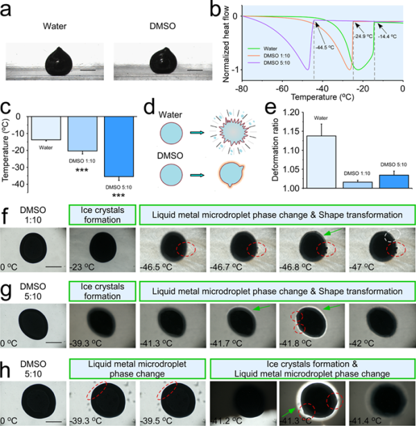 相关实验表明了体系的降温速率、溶液的组成成分可以通过改变周围的固态冰晶的形成而影响微液滴的形变,随着体系的降温速率减慢,冰晶更加坚硬,材料的形变被明显抑制。另外,DMSO混合液可以通过影响冰晶的硬度与调控溶液的相变温度两方面影响液态金属微液滴的相变。该双流体系统可作为温控传感应用在柔性液态电路中。该研究工作建立了液态金属双流体体系的分析平台,为后续材料的低温相变、热管理、应力释放等研究建立了基础。