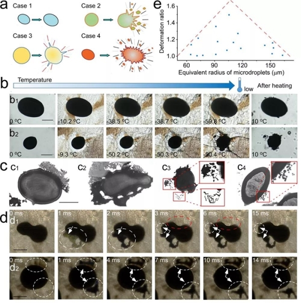 近日,中国科学院理化技术研究所与中国农业大学联合团队报道了双流体系统中液态金属微液滴的低温超快速(毫秒级别)、大尺度(13.8%)、剧烈的(形成裂纹)形变现象,研究人员系统分析了材料形变的机制及影响因素,最后将其应用在柔性液体电路中。在低温刺激下,双流体系统中水溶液率先结成固态冰晶,同时液态金属微液滴受困于坚硬冰晶之中,随着体系温度进一步降低,液态金属微液滴发生固液相转变协同体积膨胀,迅速的应力释放随即促成液态金属微液滴的剧烈形变现象。其中,实验理论估算微液滴的低温应力释放可达6.3MPa。研究人员在实验中建立了液态金属双流体系统的分析平台,分析了液态金属微液滴形变的影响因素,包括体系的降温速率、微液滴的尺寸以及周围溶液的组成成分等。另外,研究人员发现液态金属微液滴在低温下能够由于形状结构的改变,互相导通连接,可以应用在低温相应的柔性液体电路中。