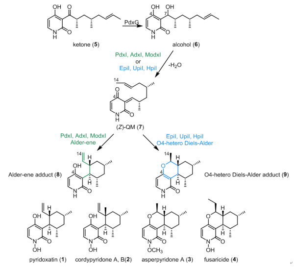 周环反应是指具有环状过渡态的协同反应,这类反应在天然产物合成中常常被应用于高效构建多个碳碳键,具有较好的立体选择性和区位选择性。2011年,美国德克萨斯大学Austin分校刘鸿文课题组首次鉴定出能够催化DA反应的周环酶SpnF。此后,科学家先后从多种天然产物的生物合成途径中鉴定出了不同的新型周环反应酶。2019年,周佳海课题组与唐奕课题组合作,系统地阐释了多功能周环酶LepI立体选择性脱水与催化杂DA反应、逆Claisen重排反应的分子机制。