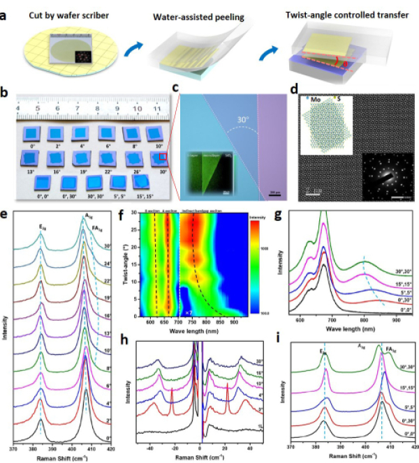 a 从单层MoS2到叠层MoS2同质结的构筑示意图;b-d 叠层MoS2的质量表征:转角精度可控、大范围均匀与干净的表界面;e-i 转角调控对叠层MoS2间接带隙及层间耦合效应的影响