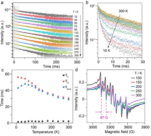 a:不同温度下Cs4PbCl6:23.6 mol% Mn2+纳米晶Mn2+的荧光衰减曲线。b:a中阴影部分放大图。c:Mn2+的荧光快衰减 (τ1)、慢衰减 (τ2)和平均寿命(τave)随温度变化关系。d:不同温度下Cs4PbCl6:23.6 mol% Mn2+纳米晶Mn2+的顺磁共振波谱