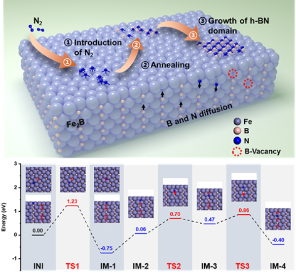 图1.Fe2B合金表面多层h-BN合成机制示意图及近表面N原子扩散能量曲线