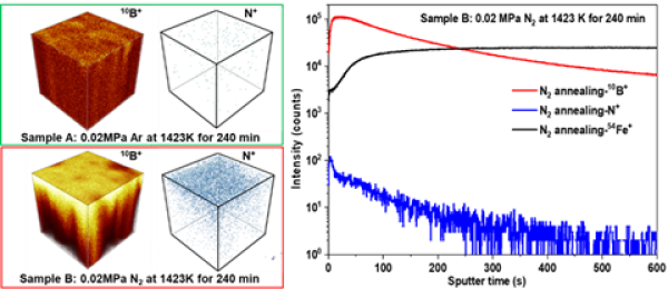 图2.基于飞行时间二次离子质谱(ToF-SIMS)的Fe2B合金浅表层B原子和N原子分布规律研究