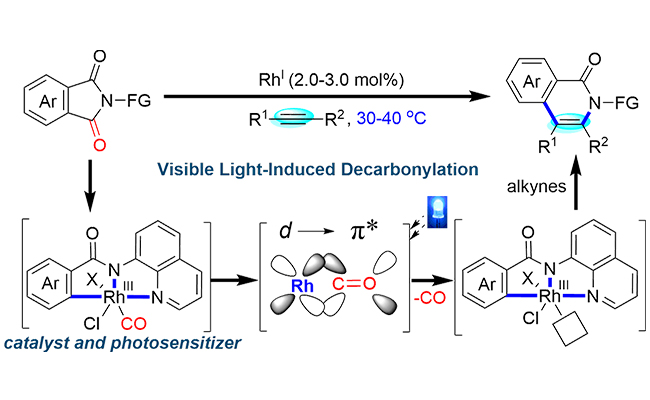 近日,大连化物所仿生催化合成创新特区研究组(02T4组)陈庆安研究员团队在可见光诱导酰亚胺温和条件下脱羰研究方面取得新进展,发展了一种“双功能铑催化剂在可见光诱导下脱羰”的新策略,可以实现酰胺类化合物在温和(30-40℃)条件下的脱碳,以及与炔烃的加成反应。