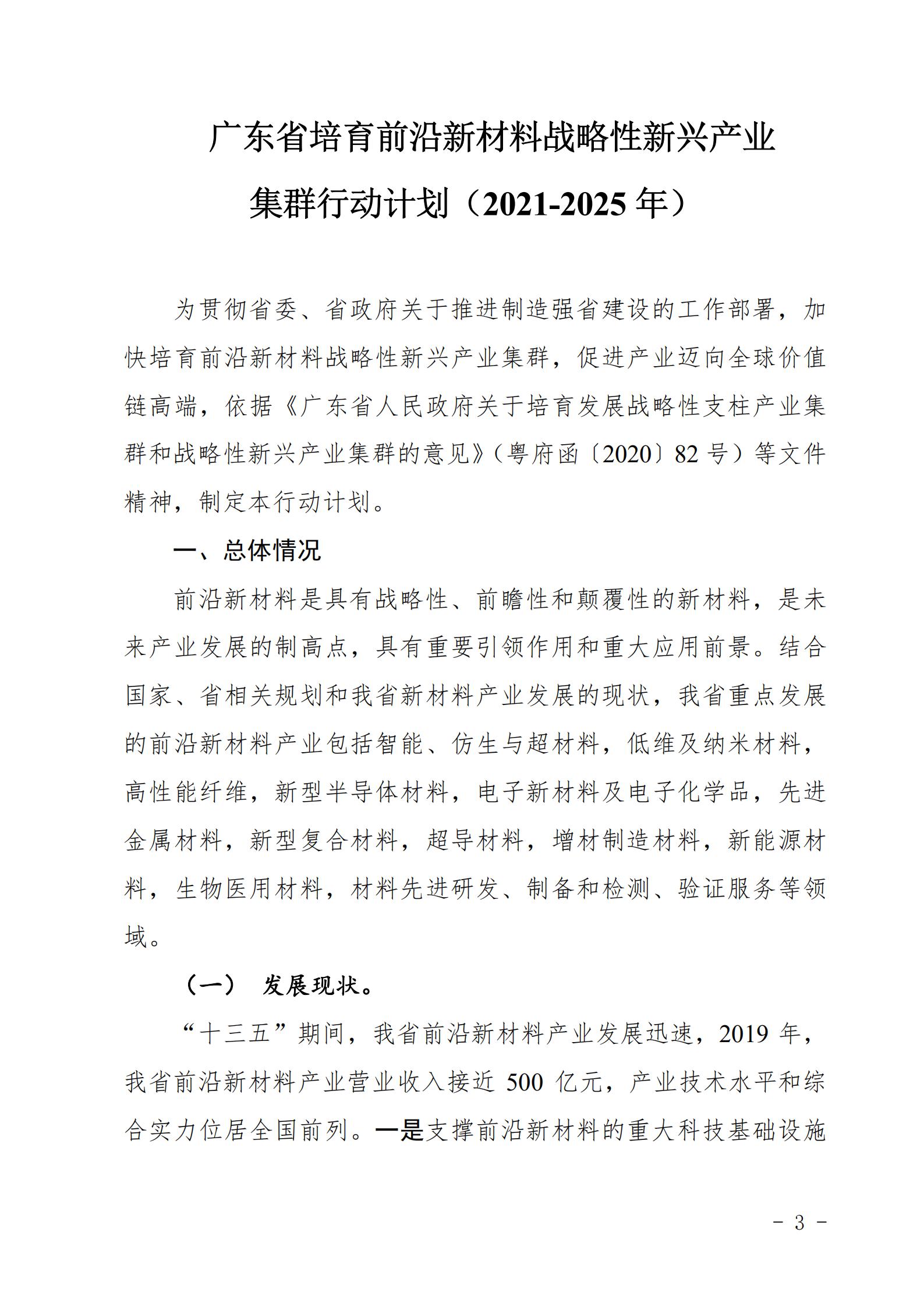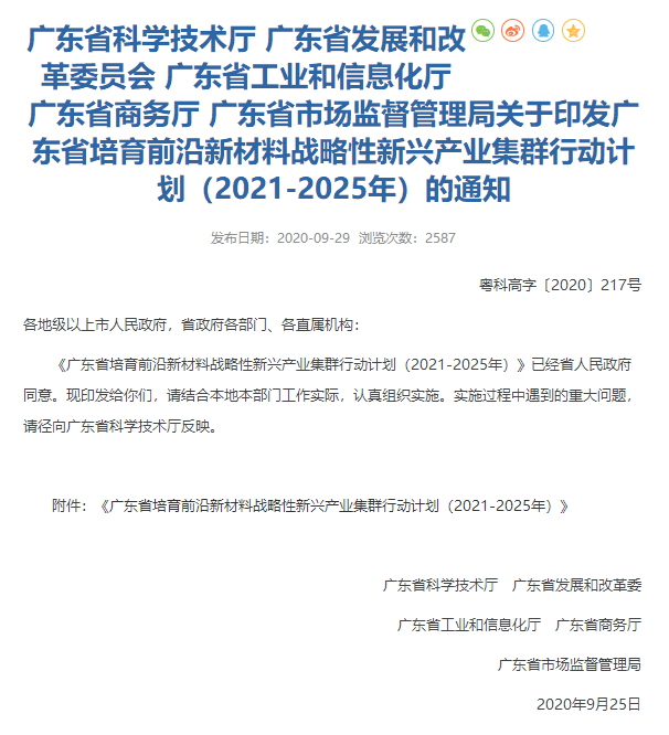 近日,广东省科学技术厅等五部门发布关于印发《广东省培育前沿新材料战略性新兴产业集群行动计划(2021-2025年)》(以下简称“《行动计划》”)的通知,提出到2025年,建立起自主创新能力强、技术特色明显、规模化程度高、产业配套齐全、全国领先的产业体系,基本建成世界级前沿新材料创新中心、具有全球重要影响力的研发和制造高地。