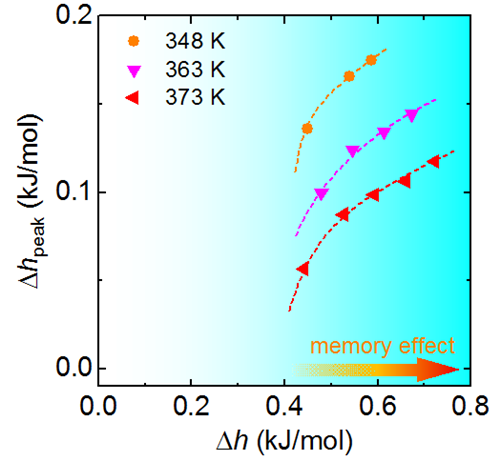 图2 记忆效应强度随着焓弛豫的变化规律,只有焓进入深度弛豫阶段时才出现记忆效应