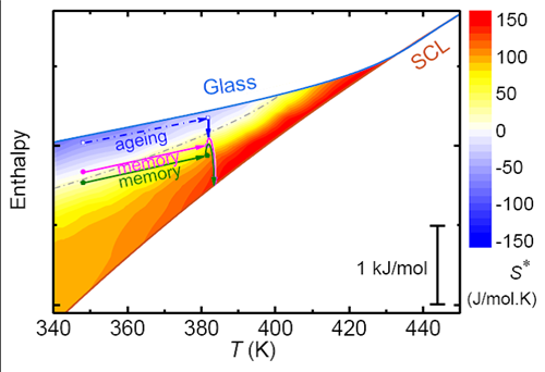 在此基础上,他们与美国威斯康辛麦迪逊大学教授Ediger、燕山大学教授王利民和郑州大学教授李福山等人合作(Phys. Rev. Lett. 125, 135501 (2020).),使用高精度闪速差示扫描量热仪研究了双步退火温度和时间对非晶合金记忆效应的影响,并基于绝对速率理论计算得到了焓和激活熵在弛豫过程的演化。他们发现只有当非晶合金焓进入深度弛豫阶段时(heavily-aged),记忆效应才会出现,这就像是一个人年老后会经常回忆年轻时候的事情。他们发现激活熵在记忆效应中具有重要作用:从低温跳向高温时,只有当高温退火阶段的激活熵比较大时,才会出现记忆效应;激活熵小,则无法探测到记忆效应。大的激活熵意味着的材料在弛豫过程中存在更多的演化路径,就像是一个人突然面对太多复杂的选择,会变得退缩。虽然这些结果是基于非晶合金这样的热激活无序体系发现的,但由于熵的概念适用于所有的无序复杂系统,因此相关结论对理解非热激活体系中的记忆效应也有帮助。