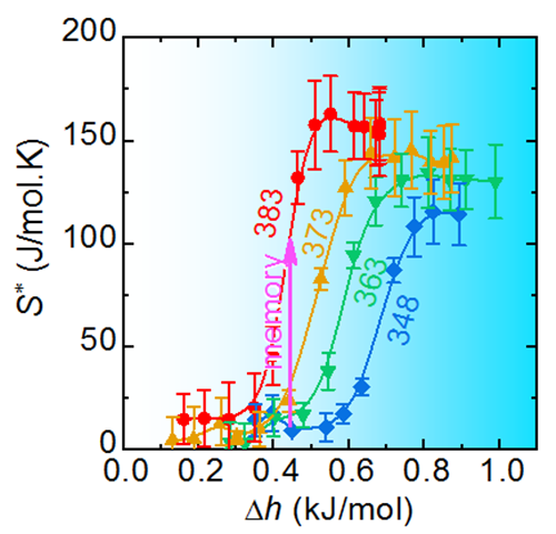 图3 基于绝对速率理论计算得到的激活熵S*与焓弛豫的关系,从低温跳向高温时,只有高温阶段具有大S*时,才会出现记忆效应
