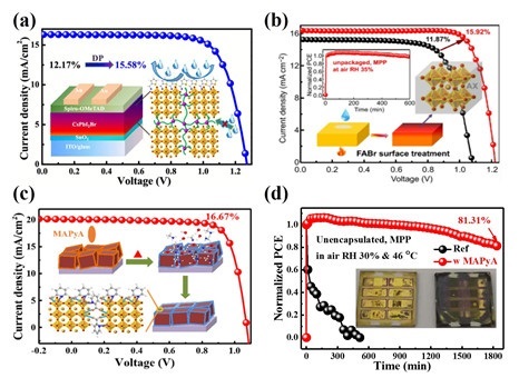 首先从器件结构和光伏参数分析,限制效率提升的主要因素是差的结晶性和非辐射复合导致的开压(Voc)损失,针对这一科学问题,研究人员将有机小分子(trimethylolpropane triacrylate,TMTA)引入CsPbI2Br钙钛矿前驱体溶液,TMTA分子中酯基能有效改善无机钙钛矿结晶,经过高温退火后分子中的双键发生交联形成网络填充晶界,实现生长调控和原位钝化保护效果,同时选择噻吩乙胺碘盐(Th-NI)为后处理剂进一步抑制界面复合,实现了双钝化保护,器件效率从12.17%提升到15.58%,且未封装的器件表现出优异的湿度稳定性,在相对湿度(RH)25%下存放1540h仍保持初始效率的83.4% (ACS Energy Lett. 2020, 5, 676-684);分布在钙钛矿表面大量不稳定的悬挂键(缺陷)是限制光伏器件的稳定性和效率另一大因素,缺陷为外界破坏提供通道促使钙钛矿分解和相变,且作为复合中心限制载流子传输造成表面复合和光伏损失,特别对于反向结构无机钙钛矿落后的效率发展。针对该问题,采用溴甲脒盐(FABr)进行表面处理,在150℃退火下FABr的扩散在钙钛矿中诱生附加内建电场加速电荷分离,同时赋予无机钙钛矿有效的表面缺陷钝化和Br-rich保护,Voc由1.078V提升至1.223V,实现反向CsPbI2Br电池最高报道效率15.92%,器件在RH 20%湿度下存放1300h保持91.7%(Nano-Micro Lett. 2020, 12, 1-13)。CsPbI3钙钛矿具有更适合的带宽,但是相变和薄膜非致密问题是其致命弱点。针对该问题,采用吡啶羧酸甲胺盐(MAPyA)进行表面原位修复和钝化,MAPyA在100℃退火时分解为甲胺气体和吡啶羧酸离子,甲胺气体能修复非致密的薄膜形貌,吡啶羧酸根能有效钝化晶界和表面,其强相互作用也可以抑制CsPbI3的相变,同时取向的吡啶羧酸离子能隔绝水分子破坏,有效解决了湿度相变问题和薄膜致密问题。器件实现了16.67%效率,是目前报道最高的反向无机钙钛矿效率,且未封装器件在RH 30%空气中持续最大功率输出1800min保持初始效率81.13%,在国际上率先实现空气中未封装无机钙钛矿器件的长时间输出(ACS Energy Lett. 2020, 5, 3314-3321)。