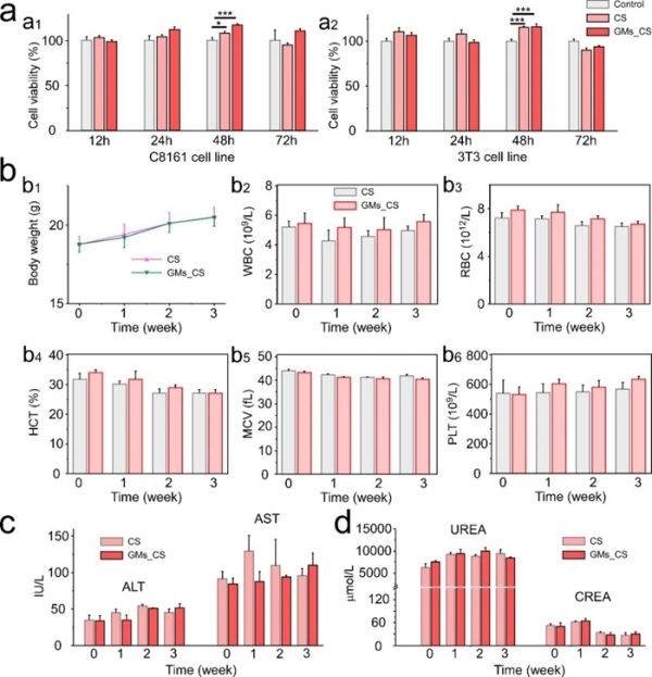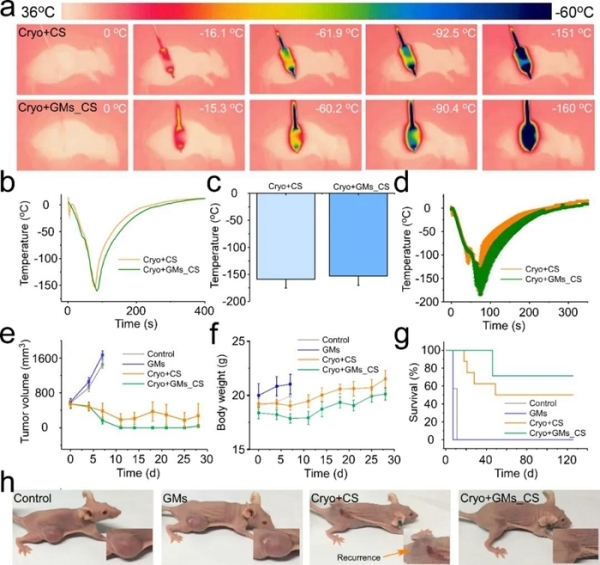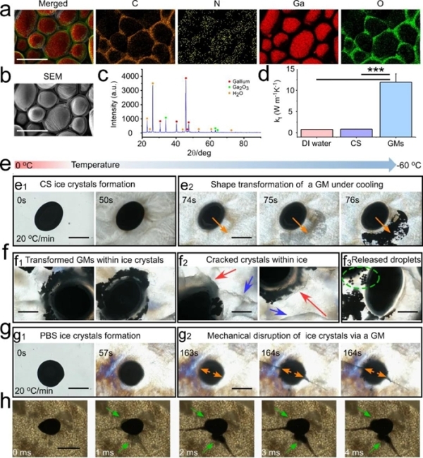 研究人员制备出一种由壳聚糖分散的液态镓微米颗粒。该材料具有高导热率,是去离子水的15.53倍。实验发现,在体系的降温过程中,镓颗粒材料在经受冻结由液态转变到固态的相变行为会激发材料的剧烈形变,甚至在某个方向快速生成尖锐微刀刃,像一把金属利剑一样刺穿坚硬冰晶。在高速镜头下,研究人员拍摄到材料爆炸样的形变行为,能够在1毫秒内刺穿150微米的坚硬冰晶。体外细胞实验及在体动物实验均表明,液态金属及其复合材料具有良好的生物相容性。三周内,动物的体重以及肝、肾功能未见异常,对此类材料后续的在体应用提供了安全性依据。
