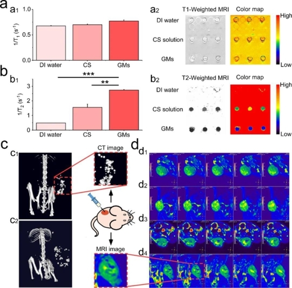 研究中,液态金属颗粒材料处于微米尺度范围,通过瘤内注射的方式递送到肿瘤部位。系列原理性试验证实,低温冷冻手术协同液态金属复合材料的机械杀伤显示出较好的肿瘤增强治疗效果。实验表明,该研究提出的液态金属颗粒材料具有良好的X射线以及CT成像效果,该镓微米材料在核磁成像中能够显著影响T2值,可以同时介导CT和MR的双模态成像。