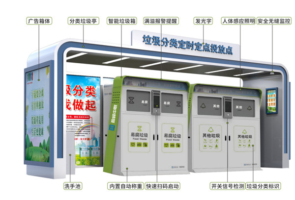 项目特点:本项目按照浙江省高标准分类示范小区建设和运营要求,采用定时定点集中投放模式,以智能化分类环保屋和分类亭为载体,采用宣传督导与积分奖励方式,短时间内快速培养居民分类投放习惯,提高居民分类知晓率、参与率和准确率。